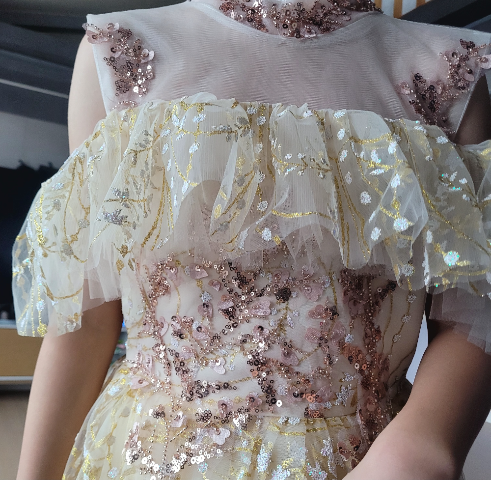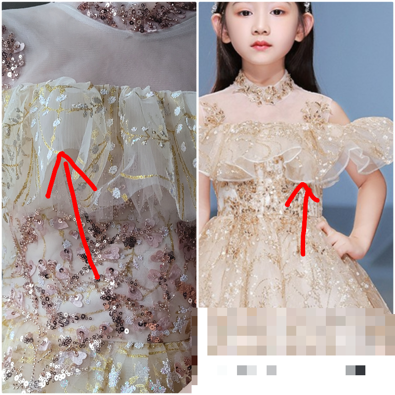 판매자님도 사진으로 보고 주문하셨겠지만, 사진을 자세히 보면 빤짝이 샤 아래 원단은 광택이 나고 힘이 있는 원단이라 실물 드레스 원단이랑 달라요