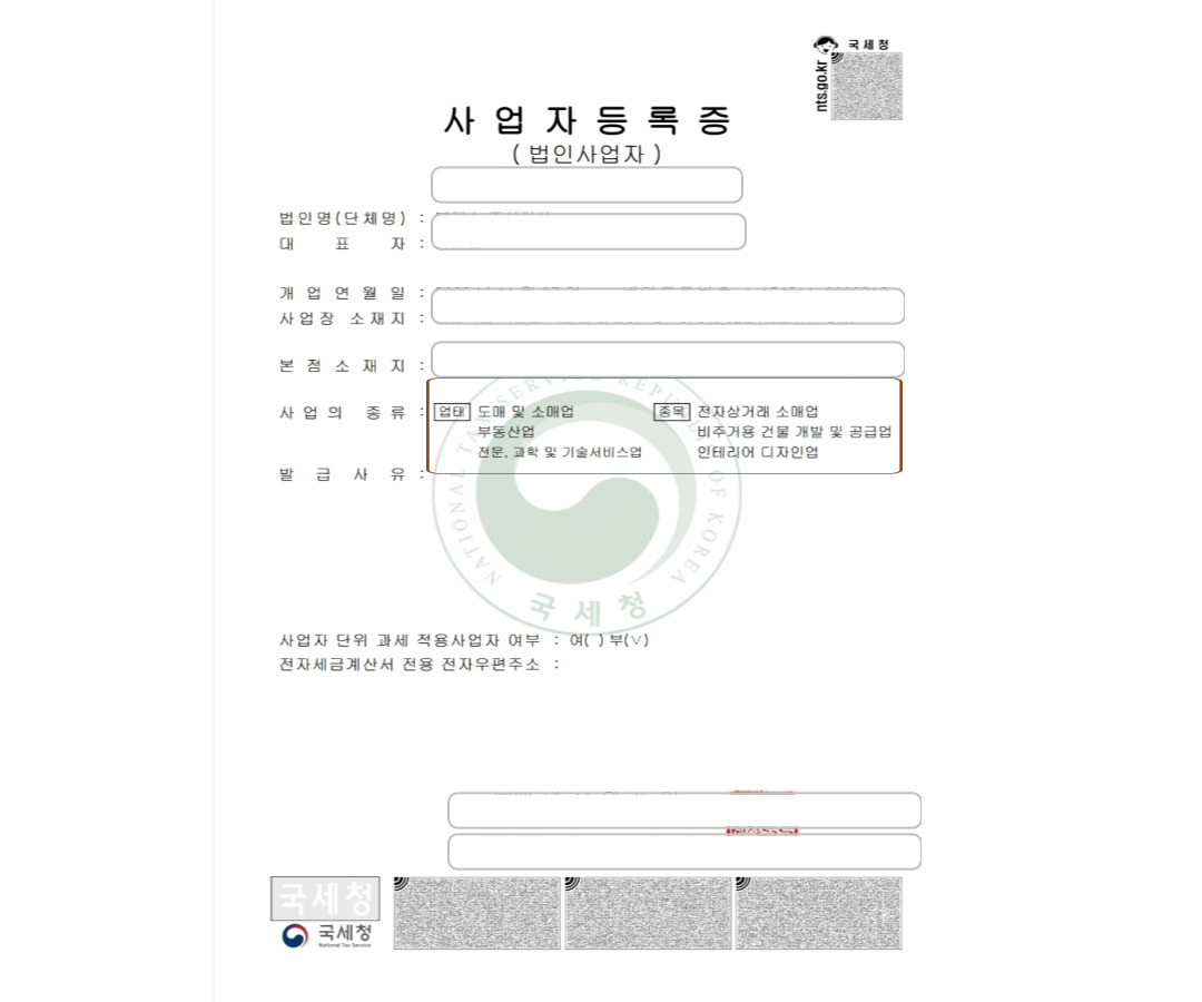 - 종목은 해당 업태 내에서 구체적으로 어떤 사업을 하는지를 나타냅니다.